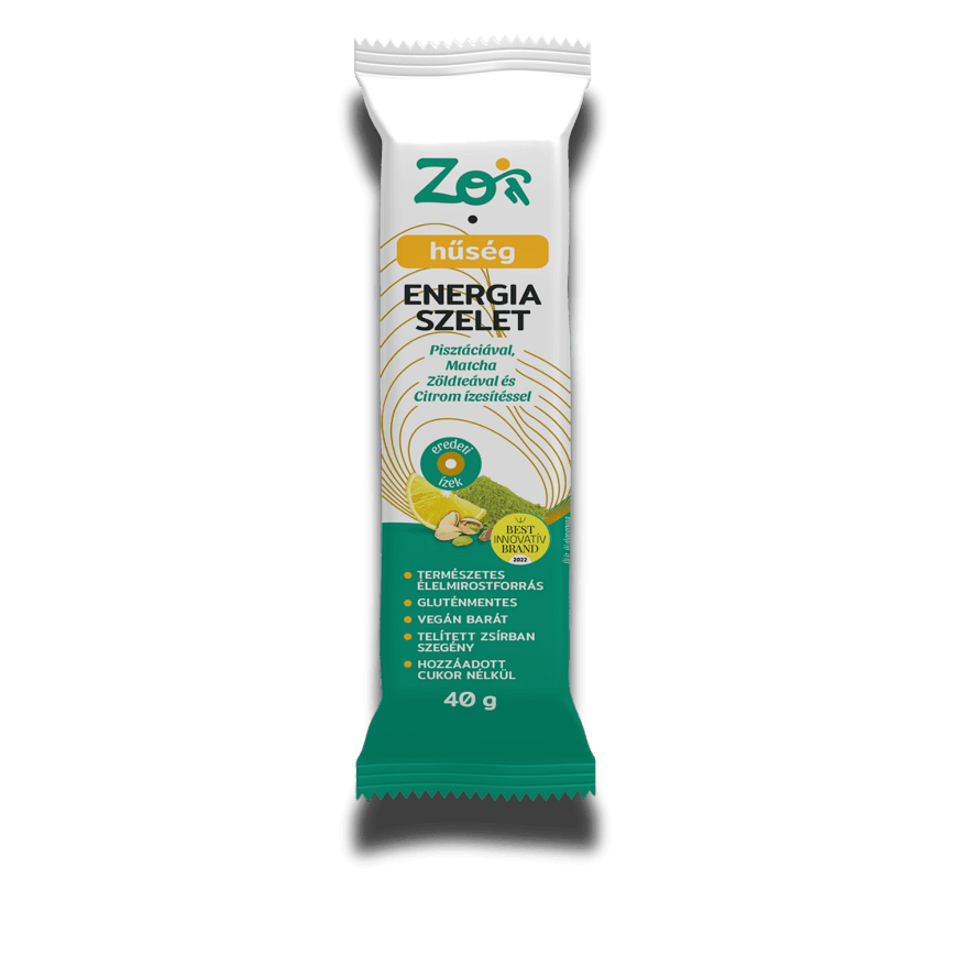Növényi alapú energiaszelet pisztáciával, matcha zöldteával és citrommal. Gluténmentes, laktózmentes, vegán, hozzáadott cukor nélkül készült, élelmi rostforrás.